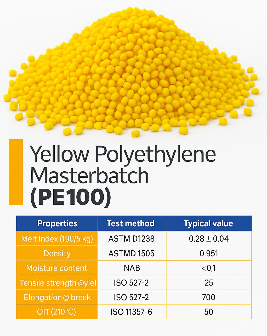 The yellow polyethylene masterbatch is a polymer mixture used to color raw polymers during manufacturing at different concentrations. It has a high content of pigments.